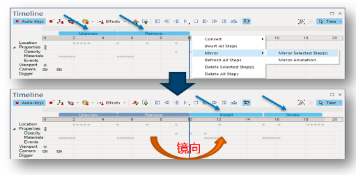 在制作裝配動畫的時(shí)候,一般都是先制作拆的動作,然后反轉(zhuǎn)。很多時(shí)候,反轉(zhuǎn)之后,要做很多關(guān)鍵幀的調(diào)整,不然會有錯亂。